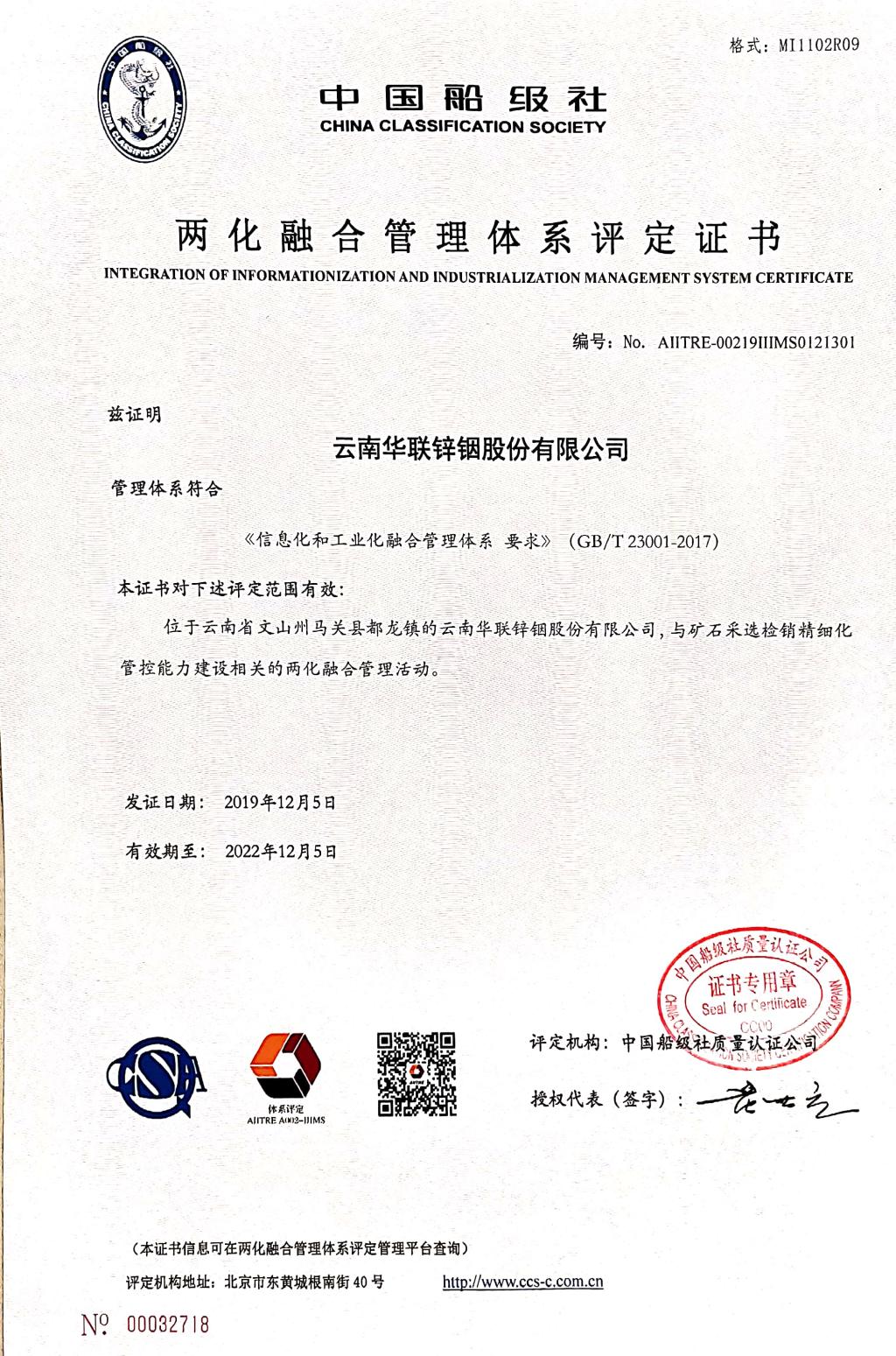 12ÔÂ5ÈÕ£¬»ªÁªÐ¿î÷¹«Ë¾Í¨¹ý½»Í¨²¿Ö±¹ÜÊÂÒµµ¥Î»Öйú´¬¼¶ÉçÁ½»¯ÈÚºÏÖÎÀíϵͳÈÏÖ¤£¬²¢½ÒÏþ¡°Á½»¯ÈÚºÏÖÎÀíϵͳÈÏÖ¤Ö¤Ê顱£¬³ÉΪÎÄɽÖݵÚÒ»¼Òͨ¹ý¸ÃÏîϵͳÈÏÖ¤µÄ³ÉÔ±ÆóÒµ¡£