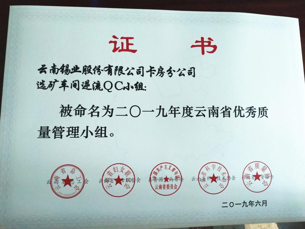 6ÔÂ27ÈÕ£¬ÔÚÔÆÄÏÊ¡ÖÊÁ¿Ð»áQCЧ¹ûÐû²¼»áÉÏ£¬¿¨·¿·Ö¹«Ë¾Ñ¡¿ó³µ¼äÄæÁ÷QCС×éÈÙ»ñ2019Äê¶ÈÔÆÄÏÊ¡ÓÅÒìÖÊÁ¿ÖÎÀíС×éÉùÓþ³Æºô¡£