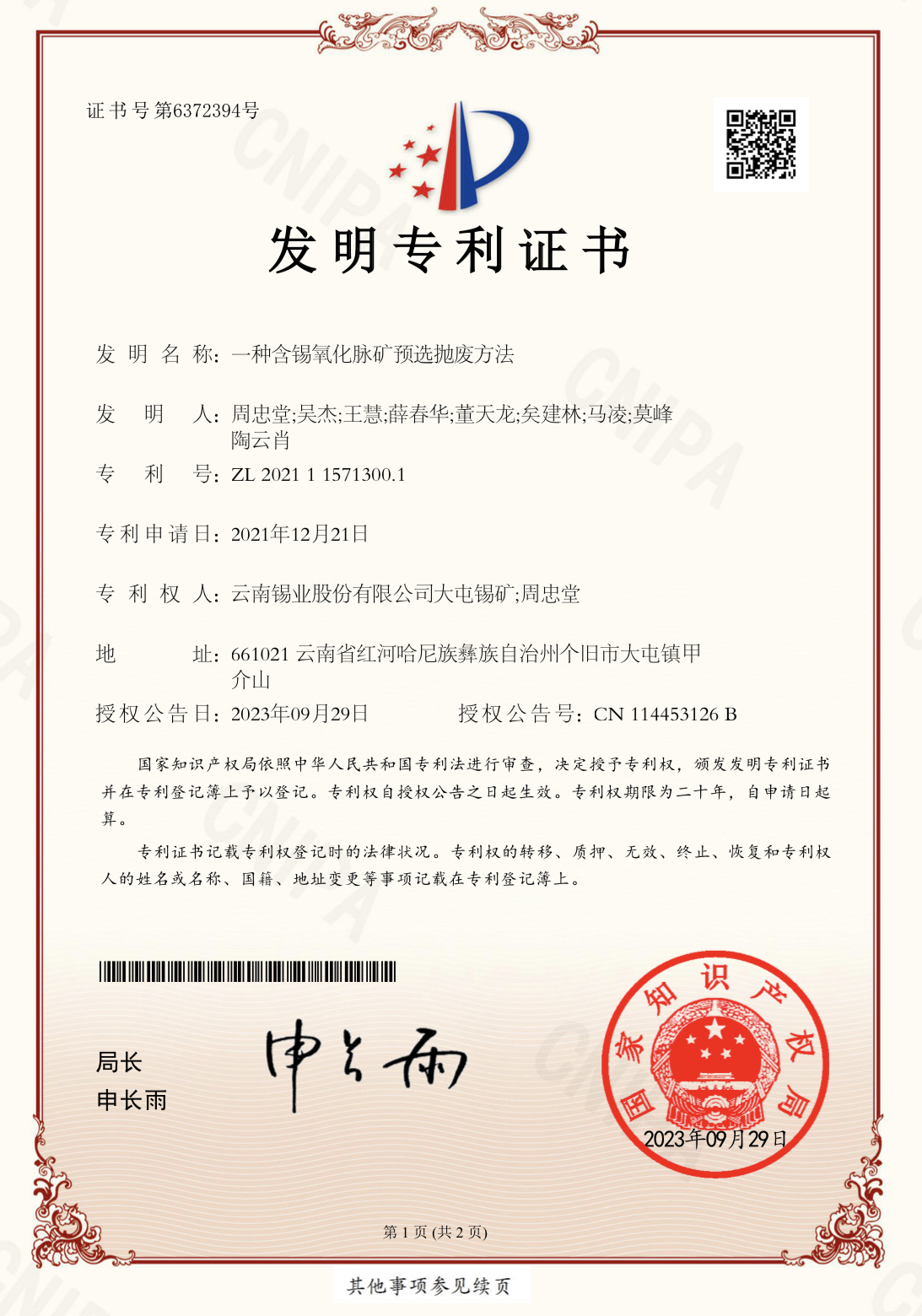 9ÔÂ29ÈÕ£¬¼Ì´óÍÍÎý¿óÑз¢µÄ¡°Ò»ÖÖÍÎý¹²ÉúÁò»¯¿óԤѡ·Ö¼¶Ñ¡¿óÒªÁ족·¢Ã÷רÀûÓÚ2023Äê6Ô»ñ¹ú¼Ò֪ʶ²úȨ¾ÖÕýʽÊÚȨµÄ»ù´¡ÉÏ£¬´óÍÍÎý¿ó¡°Ò»ÖÖº¬ÎýÑõ»¯Âö¿óԤѡÅ×·ÏÒªÁ족ÔÙ»ñ¹ú¼Ò·¢Ã÷רÀû£¡