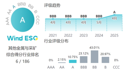 ¿ËÈÕ£¬ÍòµÃ£¨Wind£©¸üÐÂÁË2025Äê×îÐÂESGÆÀ¼¶Ð§¹û£¬ÈËÉú¾ÍÊDz©¹É·ÝWind ESGÆÀ¼¶ÓÉÒÑÍùÒ»Á¬4ÄêµÄBBB¼¶Ê×´ÎÌáÉýÖÁA¼¶£¬ÔÚ½ðÊôÓë²É¿óÐÐÒµ186¼ÒÄÉÆÀÉÏÊй«Ë¾ÖÐÏÖÔÚÅÅÃûµÚ6£¨AAºÍAÆÀ¼¶»®·Ö½öÕ¼2%ºÍ10%£¬ÏÖÔÚÔÝÎÞAAAÆÀ¼¶ÆóÒµ£©¡£ÔÚ´Ë´ÎÆÀ¼¶ÖУ¬ÈËÉú¾ÍÊDz©¹É·ÝESG×ۺϵ÷ÖΪ7.91·Ö£¬ÔÚÇéÐΡ¢Éç»á¡¢ÖÎÀíÈý¸öά¶ÈµÃ·Ö»®·ÖΪ6.95¡¢8.27¡¢5.77£¬¾ù´¦ÓÚÐÐҵǰÏß¡£
